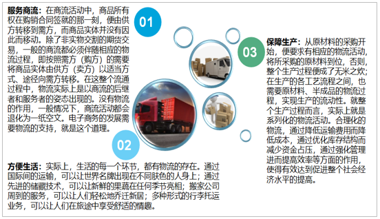 關(guān)于物流的作用,概要的說,包括服務(wù)商流、保障生產(chǎn)和方便生活三個方面。